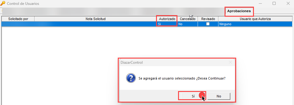 - Ir a la pestaña "Aprobaciones" > en la columna "Autorizado" poner "Si" > arrojará un mensaje y dar clic en el botón "Sí"...