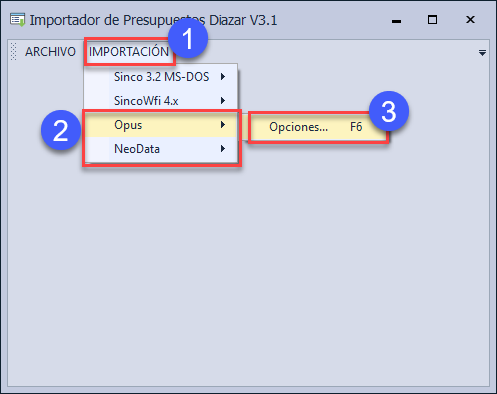 - Selecciona en el menú Importación > Opus > Opciones.