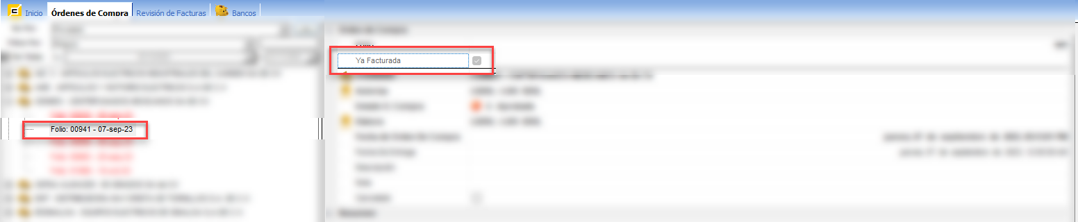 Ingresa al módulo de Órdenes de Compra y verifica si la casilla "Ya Facturada" se encuentra marcada.