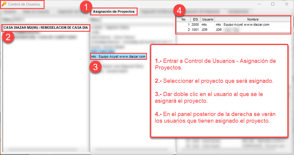 Para que tu usuario tenga asignados los proyectos, será necesario que el usuario administrador o el usuario que cuente con autorización para asignar proyectos, realice lo que se indica en la siguiente imagen:
