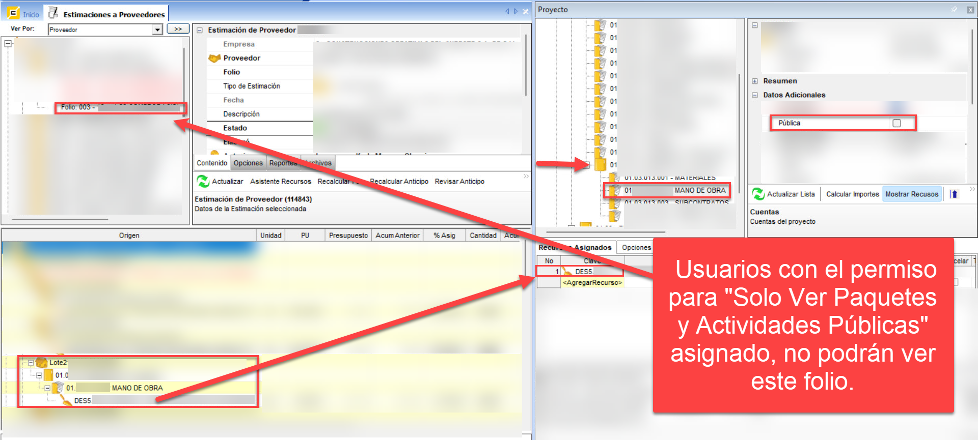 Por lo tanto, si tienes ese permiso asignado e intentas trabajar con folios cuyos recursos fueron tomados de actividades que NO tienen la casilla "Pública" marcada, el programa no te permitirá visualizar ni trabajar dichos folios.