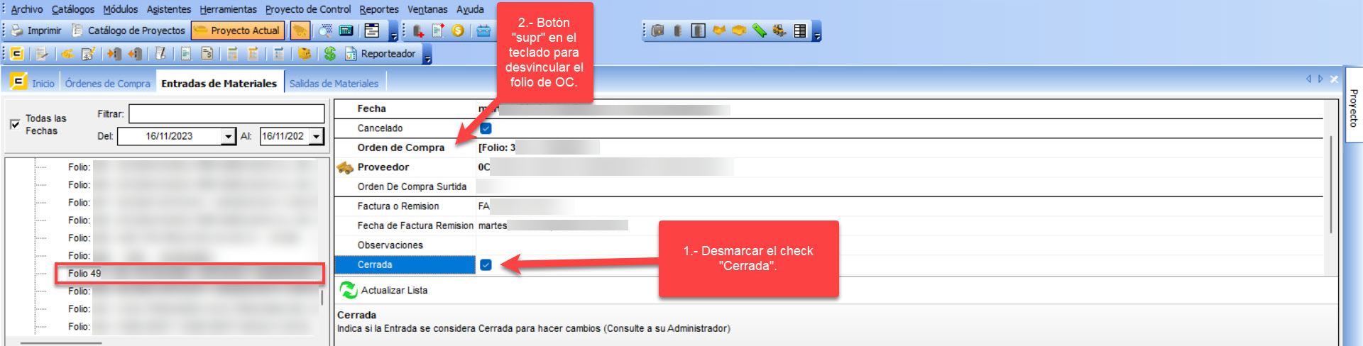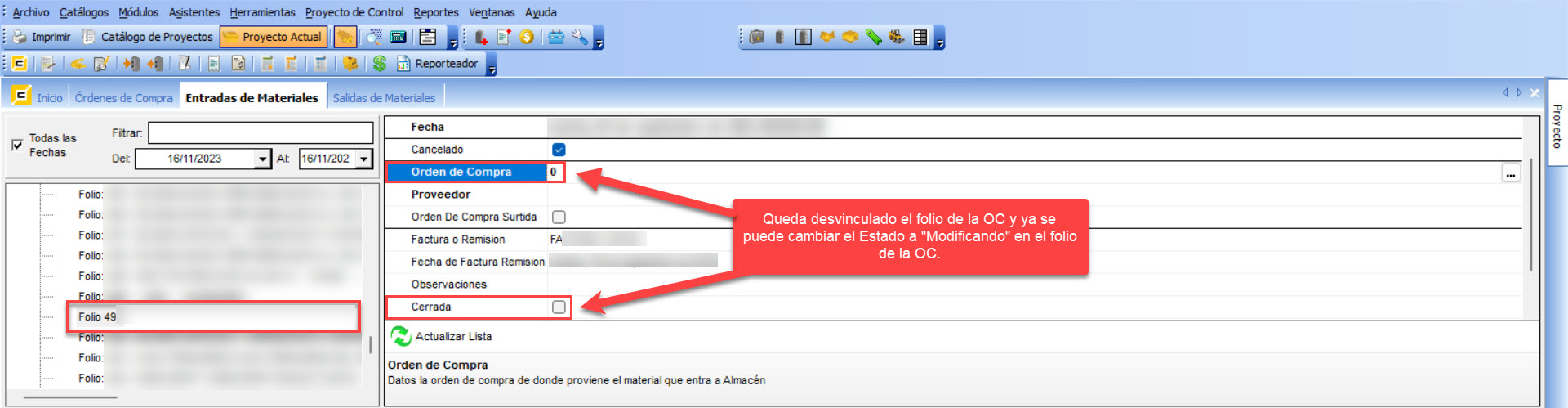 Para poder realizar el cambio de estatus de un folio de Orden de Compra, cuyo inconveniente es que está ligado a un folio de Entrada de Material, deberás desvincular el folio de la Orden de Compra realizando los siguientes pasos: