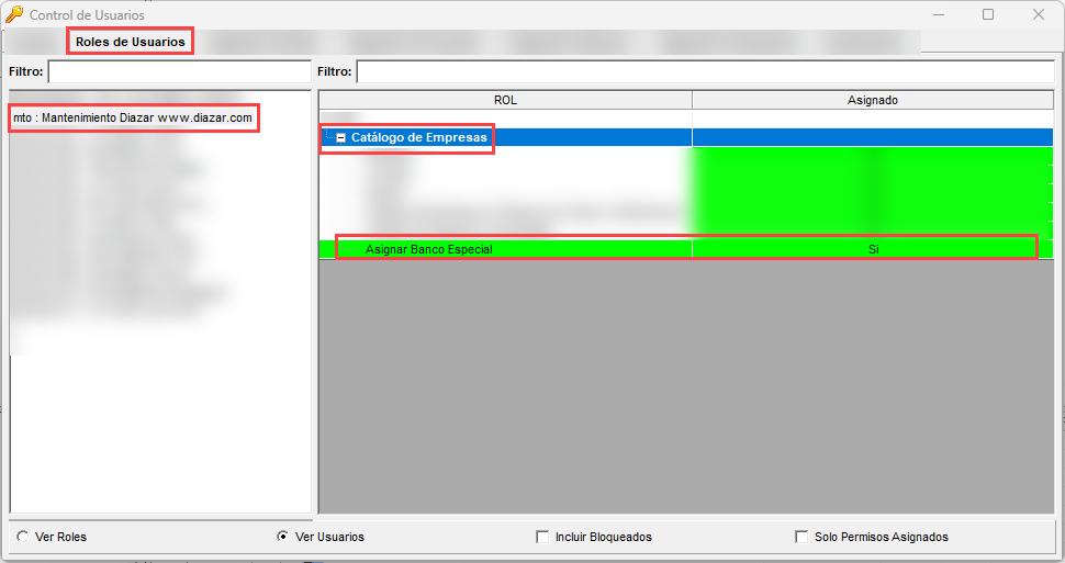 Si no visualizas el campo "C.B. Especial" al seleccionar una Empresa de tu Catálogo de Empresas, se debe a que tu usuario no tiene asignado el permiso para "Asignar Banco Especial".