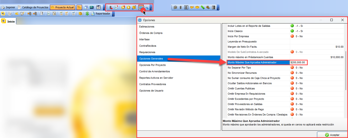 Si deseas autorizar una estimación pero el programa no te lo permite debido a que la estimación supera el monto máximo que puede aprobar el administrador, necesitarás modificar el monto desde el menú de Opciones Generales.