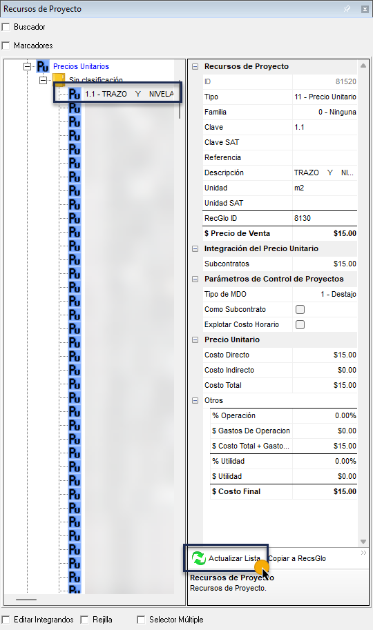 - Con clic derecho sobre la tarjeta de precio unitario, selecciona la opción "Duplicar Recursos de Proyecto".