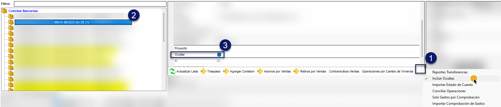 - Una vez que aparezcan las Cuentas Bancarias Ocultas (que se marcarán en amarillo), selecciona la que dejarás de ocultar.