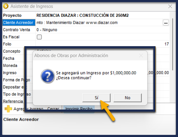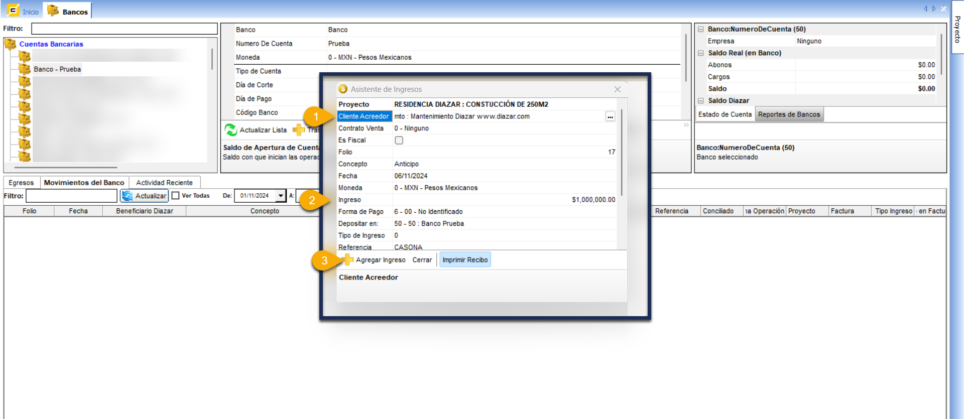Coloca el Cliente Acreditado y el monto del Ingreso